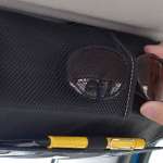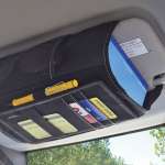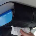 サンバイザーに巻くホルダー。ティッシュボックス入れ、カードポケット3つ、大型メッシュポケット、マルチユースバンド、ペンホルダーが付いていて収納力がかなり高い。グレーステッチで高級感もある。