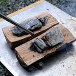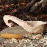 フックナイフがないときは、焚き火で作った熾を木に載せて少しずつ炭化させ、スプーンなどでこそげ取るという方法もあり。狙った方向・深さにするには欲張って大きな熾を載せず、小さめの熾で少しずつ彫り進めるのがコツ。