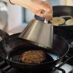 ハンバーガーパティのカバーとして業務用に開発されたため、ステンレス製で軽く錆びにくいのが魅力。少量の水か酒を入れてかぶせれば、簡単に蒸し焼きができる便利アイテム。