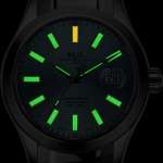 ▲インデックスと針には、蓄光ではなく自発光する「マイクロ・ガスライト」を採用。だから暗闇でもハッキリ見える