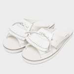 革の風合いを再現したPVC素材のアッパーに装着された二重構造のレザーキルトパーツは、その日の気分やコーデに合わせて脱着可能。カラバリとして、クリーンな清涼感をたたえるホワイトもラインナップしています。