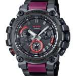 メタルと樹脂素材を融合させたプレミアムな「MT-G」シリーズ。最新モデルは樹脂部分にカーボン強化樹脂ケースを使った「新カーボンコアガード構造」を採用して、小型薄型化を実現しながらアクロバット飛行にも対応できる独自の「トリプルGレジスト(耐衝撃構造・耐遠心重力性能・耐振動構造)」を搭載。電波ソーラークォーツ、ケースサイズ縦51.9×50.9mm、カーボン&SSケース、スマートフォンリンク機能、20気圧防水