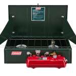 ダッチオーブンや鉄板料理も対応するガソリンツーバーナー。シンプルな構造のため自分の手で補修できて趣味人の心をくすぐる