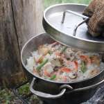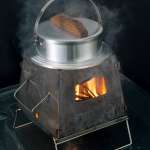 対流が起きやすいスリ鉢型・アルミ鋳造・重いフタなど、おいしい米を炊くために生まれた羽釜。「ネイチャーストーブ ラージ」(8500円)にセットすれば、かまど炊きを再現できる。φ20.6×H15cm、1.35kg