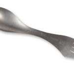 スプーンとフォークとギザ刃がそろった簡易カトラリー。カラフルモデルもいいけれど、チタン製は調理にも使えるのがいい