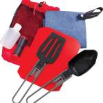 汁物をすくうのに便利な折りたたみスプーンとフライ返し、まな板(18.2×14cm)、塩・コショウ・油を収納するのに便利な調味料入れ、タオルという、これさえあればなんとかなる、お守りのような調理ツールセット。136g