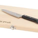 燕三条エリアで生まれたステンレス製包丁は切れ味抜群。実用的なサイズの天然木まな板は、ゴム脚付きで滑りにくい。細部にわたって計算された設計が、野外での本格調理をサポートする。25.6×20×H1.7cm、470g