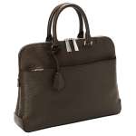 オイルを浸透させた後に波状の型押しを施したオリジナルの「ウェーブレザー」を採用。そのハリとツヤ、両端を上に折り曲げてサポート力を高めた底面の効果で、優美なシルエットながらしっかりと自立する。正面と裏面で形状を変えたアウトポケットのデザインと使い勝手が両立しているのもさすが。W37.5×H28×D8cm