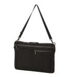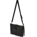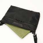 メイン素材は600デニールのポリエステル。表面はエコ系のポリウレタンと綾織りをイメージした離型紙を用いて、微妙な光沢のあるゴムのような質感に。ショルダーストラップが着脱可能で、ファスナーはYKK製の撥水性・止水性に優れたものを採用。W30×H21.5×D3cm