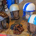 ▲ヘルメットは1950〜60年代のものを海外通販を利用して集めている。アルミ製の帽体、革の内装など当時の素材使いも新鮮だ