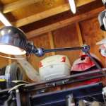 ▲作業の手元を照らすのはジェルデ社の工業用ランプ。オリジナルの塗装は剥離してクリアを吹き、金属の素材感を活かしている