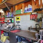 ▲作業台を備えたガレージ内の鉄製什器。板金の技術を活かし、設計から溶接まですべて伊津美さんが手がけている