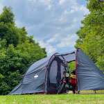 前室が広く、バイクを丸ごと格納できる専用テント。キャンプサイトで愛車と一緒に泊まれる。盗難やいたずら対策にも効果的。大人ふたりがゆったり過ごせる大きなインナーテントは、フロア浸水を抑制するグランドシートを付属。