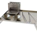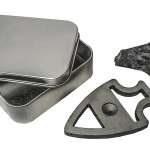 火打ち石とマルチファイヤーツール、携帯コンテナのセット。マルチファイヤーツールは火打ち鎌として使うほか、火キリ棒を押さえるためのくぼみを備えており、弓ギリ式火起こしの挑戦も可。収納サイズ:9×7cm、重さ:155g