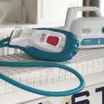 ▲電源ボタンとスチームボタンを押すだけのシンプル操作。高い所も本体を置いて掃除できるので腕が疲れにくい