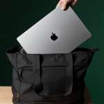 優れた耐久性や耐水性を誇る500デニールコーデュラナイロンを採用したトートバッグ。16インチのMacBookがすっぽり入る大容量で、ジップ開閉式のため中身が見えず、安心して荷物を持ち運べる。約H32×W52×D18cm