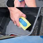 ▲(1)スポンジの穴にねんどクリーナーをセット(2)スポンジとねんどクリーナーをバケツの水にたっぷりと浸す(3)最後は滑らせるようにクルマのボディをなでる。塗装面をスベスベに仕上げられる