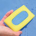 ▲スポンジは片手でつかめるサイズ。バケツ一杯の水があれば作業できるので、水道のない駐車場で便利