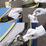 ▲精密研磨パッドに液剤を取り、直線方向を意識してキズが気になる部分を磨く。キズが消えない場合は、最初に精密研磨パッドで磨いた後、次にコンパウンド専用スポンジで下磨きをし、再び精密研磨パッドで磨く。最後に柔らかい布で拭き上げる