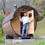 ▲バレルサウナの外観はまさに巨大な樽そのもの。直径・奥行きともに約2mだが、内部は大人4名での使用に十分な空間を備えている