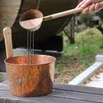 ▲FIRESIDEが展開するオリジナルの銅製ロウリュグッズを愛用。ひしゃくの3つの穴から繊細な水落ちを楽しめる