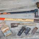 ▲薪割りには斧、鉈、くさび、ハンマーなどを木質に合わせて使い分ける。手前の鉈やくさびは、知人の蔵から出てきた江戸時代に製造されたものらしい