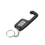 導電シリコーンを使用したキーホルダー。持ったまま先端を金属面に触れさせることで、対象物に直接触れることなく静電気を逃しショックを軽減できる。先端は鍵形状なのでバータイプのドアノブなら引っ掛けて開けられ、ウイルスの感染リスクも軽減できる。