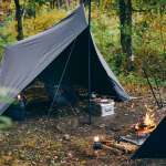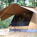 シェルター+陣幕の構成にすることで、焚き火時の使用もバッチリ。風防効果で火が消えにくく、調理や暖をとるのに役立つはずです。ちなみに焚き火で使用する際は、換気のため寝室のシェルターを全開にする必要があります。