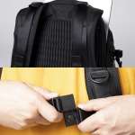 ▲(上)背面部分に長時間の着用による疲労を緩和させる素材、キュービックアイピケライトを採用。(下)チェストストラップはマグネット式で着脱が簡単