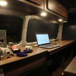 ▲仕事の合間のティータイムも車中で。ミニシンクも取り付けできるので、簡単なものなら調理も可能