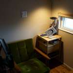 ▲デスク裏にはお気に入りのチェアを設置。疲れたときの休憩スペースとして利用している。