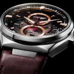 スーパーチタニウム製のケースは非常に軽く、4カ所のインデックスをリング上に配置して視認性を高めた多層構造の文字盤も面白く、艶やかなバーガンディカラーにピンクゴールドの存在感が光る1本。