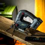 木材であれば約50mm、軟鉄板は約3mm、アルミ板ならば6mmまでの材料を曲線的に切断できるジグソー。もちろんガイドを当てれば、直線的に切断することもできて、底板の角度調整で左右0〜45度までの傾斜をつけて切断をすることも可能だ。