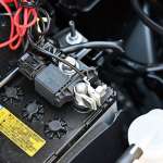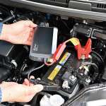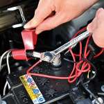 ▲バッテリーのプラスとマイナス端子にクリップを挟み、約30秒ほど待ったあとエンジンを始動させる