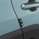 裏側の両面テープで、ドアの後方部分に貼り付ける。軟質素材なので、ドアを開けたときに壁にぶつけて傷が付くのを防いでくれる。凹凸が付いた無骨なデザインで、つや消しシルバーメッキに仕上げたボルト風パーツが付いている。