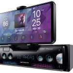 専用スマホアプリとリンクするカーオーディオで、まるでディスプレイオーディオのような使い心地を実現。本体のアイコンにタッチすると、スマホにインストールした連携アプリが立ち上がり、カーナビやオーディオの機能を活用できる。スマホは内蔵のクレイドルにセット。