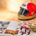 ▲MotoGP殿堂入りを果たしている往年のレーサー、ジャコモ・アゴスティーニのレプリカヘルメットと写真集。ヘルメットは普段使いはしないものの、補修を重ねながら大切に保管している