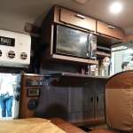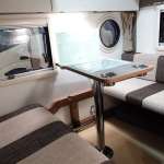 ダイネットは対面式の4人掛けで、サイドにはキッチンを設置。カップホルダー付きのテーブルを使わない時は専用スペースに収納できます。キャビン上部には天井を囲むようにキャビネットがつけられているので、小物や生活道具の収納に便利。