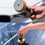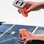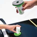 ▲幅8cmの楕円形ヘッドを採用。角が丸くガラスの端まで塗り込める。1本でフロントガラス約15枚分を施工できる