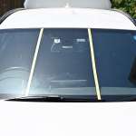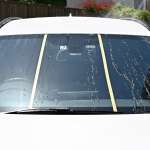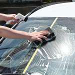 ▲ガラスに付いた汚れを洗い流し、油膜も除去。撥水性を比べるため製品ごとにマスキングテープで仕切った