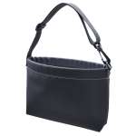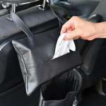 レザー調で高級感があり、500mlペットボトルが3本入る大容量サイズのゴミ箱。上部のベルトをヘッドレストシャフトに掛けるだけで簡単に装着でき、ベルトの長さも調節できる。