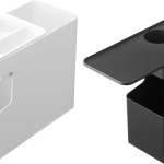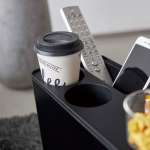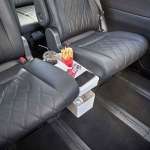 上部は飲食物やスマホなどを置ける小物入れ付きテーブル、下部はゴミ箱になっている。ゴミ箱の開口部が広いので、ペットボトルなども捨てやすい。フタを前にスライドすれば、後席からゴミを捨てることもできる。
