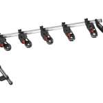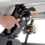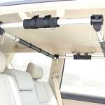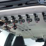 5本の竿を天井に固定できるロッドホルダー。ロッドの固定部分は後方側のみで前方にはないため、車高が低いクルマに取りつけたときに、座った人の頭上はスッキリ。バスやトラウトロッドに最適なテンションホールドタイプ。