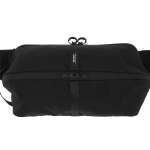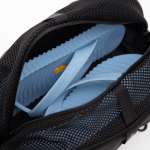 リサイクルコーデュラナイロンを主素材に使用したシューズケース兼スリングバッグ。中央のテープを左右に引っ張るだけでバッグを開口できる。普段使いにも最適。30cmまでのシューズに対応。H11.5-23×W32×D11cm