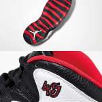 NBA 2連覇を達成した1996年シーズンに着用された12代目。1枚革で構築されたアッパーに放射状ステッチをあしらった本モデルでは、トゥからサイドへと大胆に伸びたサポートパーツが目を引く。背面にはジャンプマンと23の文字が記されている。またシリーズ初のズームエアが搭載されているのも特徴で、プレーヤーたちからも機能性、耐久性ともに高評価を得た。