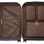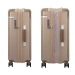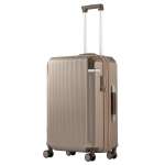 周囲のファスナーを開くことで容量を増やせるスーツケース。ポリカーボネート製ながらメタリックフィルムで金属調に仕上げ、コーナーにレザーパッドを配した高級感のあるデザインも魅力。H68×W46×D27(32)cm