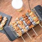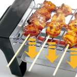 焼き上がりの待ち時間も楽しい一人用焼き鳥焼き機。串をセットすると自動で回転し、焼き上がるまでの時間も楽しめる。ガラスカバー付きで油や煙が広がらないほか、小型で卓上でも邪魔にならない。