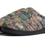 難燃性のコーデュラ素材を使用したサンダル。ダウンのように暖かく、フィット感抜群の履き心地で、これからの季節のキャンプやグランピングの室内履きで重宝。シューズバッグ付き。