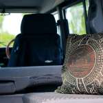 ジャガード織のクッションカバー。普段から車の中に入れているクッションにつけておけば、キャンプの際はそのままテントに。使って楽チンでテント内の雰囲気もアップ。