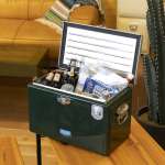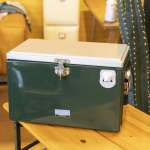 ラフなメタルの質感の深緑のボディや艶消しシルバーの蓋が存在感を主張する、保冷剤や氷などで冷やすことができるアイスボックス。保冷時間は開閉回数や内容物の量にもよるが約24時間。